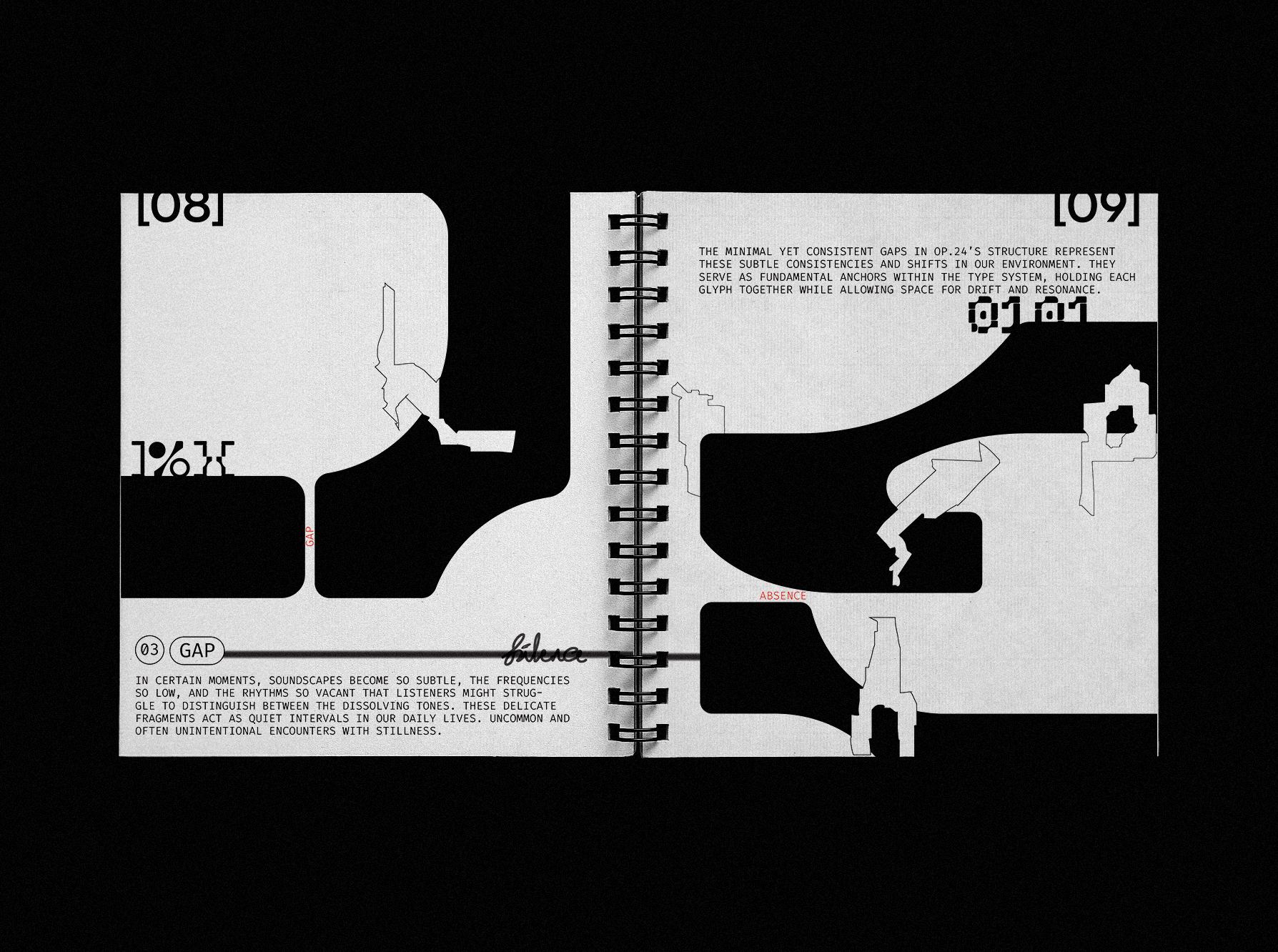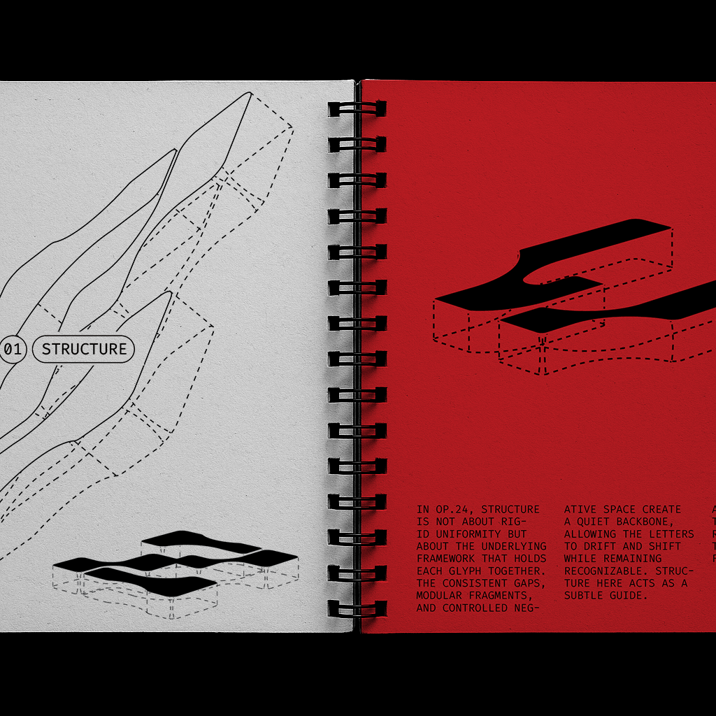 Op.24 DISPLAY began as a freehand experiment to create interchangeable glyph sequences that feel both mechanical and conscious. Built on sonic and time-based concepts, the typeface uses a monospace system to maintain rhythm and legibility, with deliberate gaps suggesting silent compositions. By stripping away sharp contrast and rigid forms, Op.24 stays modular and freeform within a calm, uniform structure.